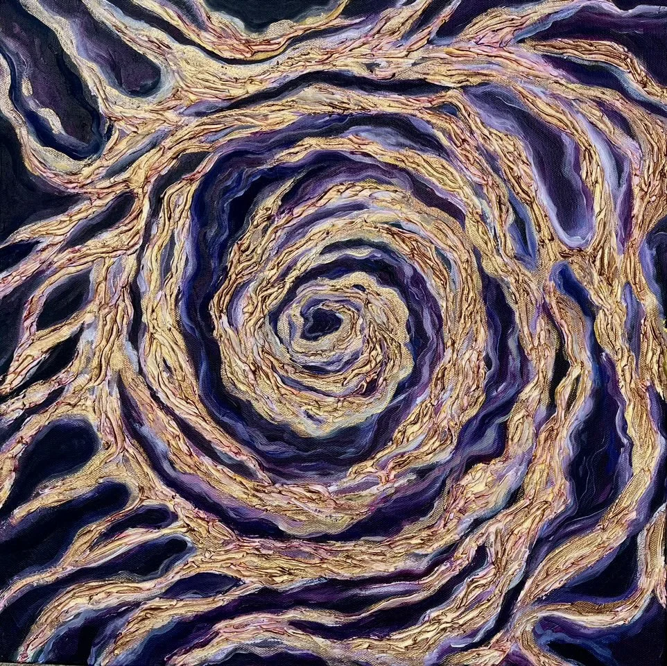 Acrylics enable me to paint in thick layers. As I add each layer, I use my intuition in order to further develop a composition. Through this build-up of material, I am able to create a dense texture that conveys the passage of time to the viewer. Themes of life and confrontation are perpetuated by the protrusion of paint, creating a sense of tension between both the viewer and the work itself. I am very drawn by how the human body mimics nature. It does so through repeating patterns called fractals. An example of these fractals are spirals and branching patterns. Spirals are seen in human blood cells, as well as in shells and flowers. The branching of our blood vessels and bronchial tubes mimic the growth patterns of trees. Veins and roots appear in almost all of my recent work. These similarities in structure emphasize our human connection to nature. We are all governed by the same cycle of life and death, and will inevitably return to the Earth in time.